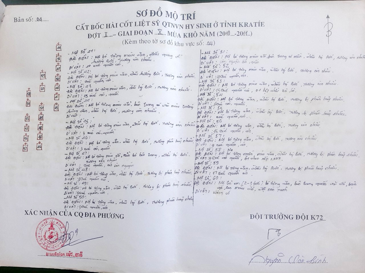 Theo thông tin nhân chứng cung cấp: Khu mộ này trước đây người dân biết là khu vực mộ của bộ đội Việt Nam, sau này khi cày lên thấy tăng, nhân dân báo cho Đội K72 vào đào tìm, kết quả quy tập được 20 mộ liệt sĩ. Trong 20 mộ này đều có tăng màu đen và màu đỏ, đầu quay về hướng Bắc, xương còn nhiều. Một số mộ có đặc điểm và di vật cụ thể như sau: Mộ số 51 chôn bó tăng màu đỏ, bên trong có mền, đầu quay về hướng Bắc, xương còn nhiều, di vật còn nguyên quần, áo. Mộ số 53 chôn được bó tăng màu đen, đầu quay về hướng Bắc, xương còn nhiều, di vật gồm 1 hộp dầu cù là và 15 cúc áo. Mộ số 58 chôn được bó tăng màu đen, đầu quay về hướng Bắc, xương phân hủy nhiều, di vật gồm 1 dao xếp bằng inox, 9 cúc áo quần.