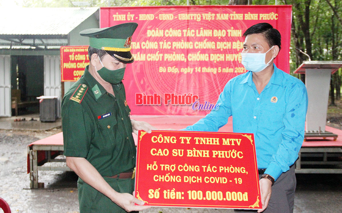 Đại diện Công ty TNHH MTV cao su Bình Phước hỗ trợ Bộ đội biên phòng phòng, chống dịch 100 triệu đồng