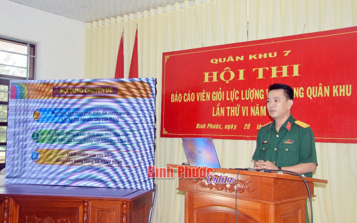 Trung tá Huỳnh Tấn Lực, Chính trị viên Ban CHQS thị xã Phước Long báo cáo chuyên đề tại hội thi