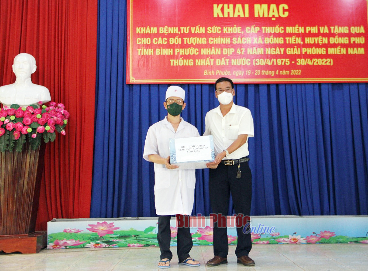 Phát biểu tại chương trình, Thiếu tướng Nguyễn Văn Bình nhấn mạnh: Chương trình góp phần san sẻ phần nào khó khăn của các gia đình chính sách cũng như các hộ có hoàn cảnh khó khăn. Đây là lần thứ hai đoàn đến khám bệnh, cấp thuốc miễn phí và tặng quà gia đình chính sách, hộ khó khăn tại xã Đồng Tiến, huyện Đồng Phú - địa bàn đóng quân và là địa phương kết nghĩa của Kho 882, Cục Quân khí.