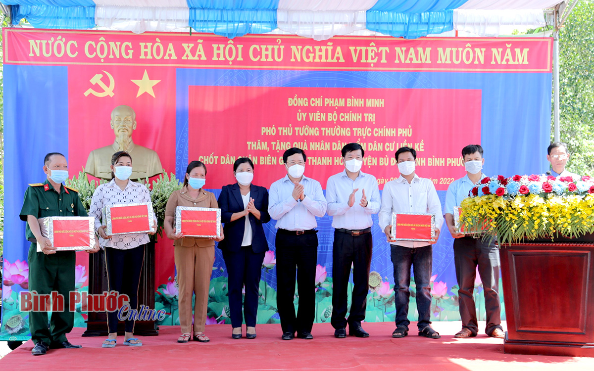 Phó thủ tướng Thường trực Chính phủ Phạm Bình Minh và Ủy viên Trung ương Đảng, Bí thư Tỉnh ủy Nguyễn Mạnh Cường; Phó bí thư Tỉnh ủy, Chủ tịch UBND tỉnh Trần Tuệ Hiền tặng quà cho người dân tại khu dân cư liền kề chốt dân quân biên giới xã Thanh Hòa, huyện Bù Đốp