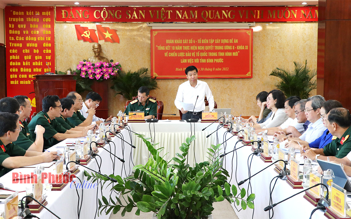 Báo cáo với đoàn khảo sát, đại diện Ban Thường vụ Tỉnh ủy cho biết: Trong 10 năm qua, tỉnh Bình Phước đã tổ chức quán triệt, thực hiện nghiêm túc Nghị quyết Trung ương 8, khóa XI về chiến lược bảo vệ Tổ quốc trong tình hình mới và đã đạt những kết quả quan trọng. Đặc biệt, tỉnh Bình Phước luôn chú trọng thực hiện nhiệm vụ phát triển kinh tế gắn với bảo vệ quốc phòng - an ninh. Bình Phước cũng chủ động trong đổi mới phương thức lãnh đạo của Đảng, tinh gọn tổ chức bộ máy, nâng cao hiệu lực, hiệu quả hoạt động của hệ thống chính trị; tích cực cải cách hành chính.