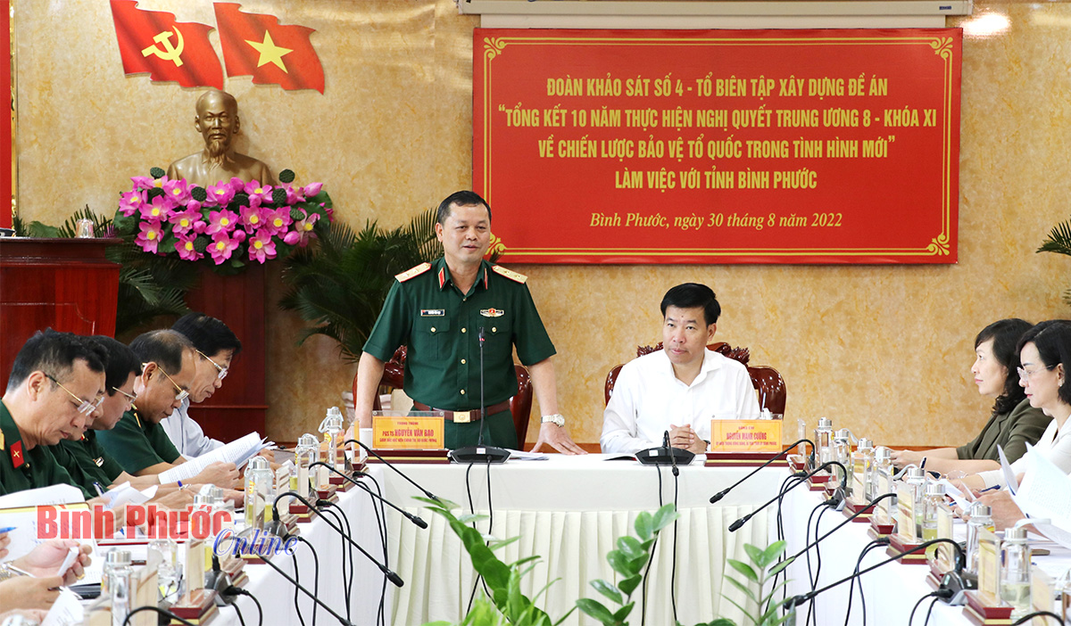 Phát biểu tại buổi làm việc với đoàn khảo sát, Ủy viên Trung ương Đảng, Bí thư Tỉnh ủy Nguyễn Mạnh Cường cho rằng: Việc “Tổng kết 10 năm thực hiện Nghị quyết Trung ương 8, khóa XI về chiến lược bảo vệ Tổ quốc trong tình hình mới” sẽ giúp các cấp, ngành, địa phương, đội ngũ cán bộ, đảng viên và nhân dân ở Bình Phước nâng cao nhận thức về chiến lược bảo vệ Tổ quốc trong bối cảnh có những diễn biến mới ở khu vực và trên thế giới. Đặc biệt, cần phải có những nhận thức rõ ràng, sâu sắc trong chiến lược bảo vệ Tổ quốc. Các định hướng về bảo vệ Tổ quốc còn nhiều yêu cầu đặt ra, cần phải xem xét, đánh giá một cách toàn diện, gắn chặt với những diễn biến trong bối cảnh mới. Sắp tới, Bình Phước nỗ lực hoàn thành việc tổng kết 10 năm thực hiện Nghị quyết Trung ương 8, khóa XI về chiến lược bảo vệ Tổ quốc trong tình hình mới để làm cơ sở cho Trung ương xây dựng Đề án tổng kết nghị quyết này.