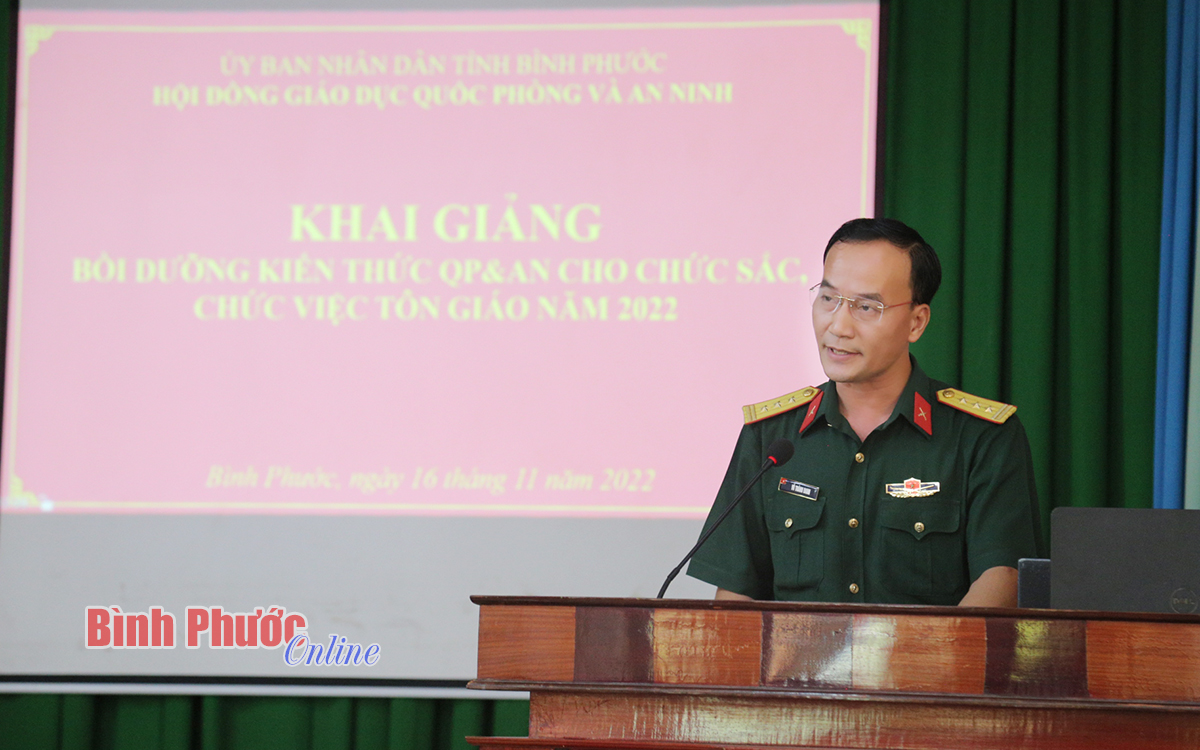 Thượng tá Võ Thành Danh, Phó Chỉ huy trưởng, Bộ CHQS tỉnh phát biểu khai mạc và quán triệt một số nội dung lớp bồi dưỡng
