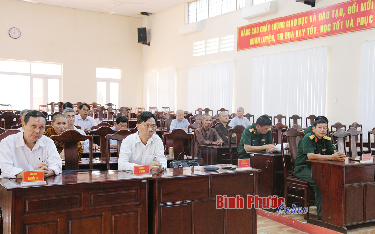Các đại biểu, chức sắc, chức việc dự lễ khai giảng lớp bồi dưỡng tại điểm cầu Trường huấn luyện quân sự, Bộ CHQS tỉnh Bình Phước