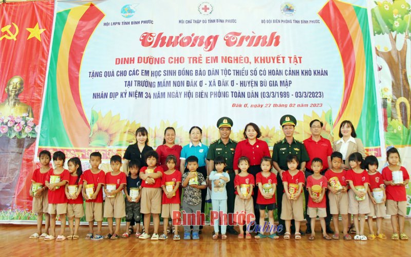 Bình Phước: Thiết thực Ngày hội biên phòng toàn dân tại xã Đắk ƠBPO - Kỷ niệm 34 năm Ngày Biên phòng toàn dân (3-3-1989 - 3-3-2023) và 64 năm Ngày truyền thống Bộ đội biên phòng (3-3-1959 - 3-3-2023), sáng nay 27-2, Hội Chữ thập đỏ tỉnh Bình Phước phối hợp Hội Liên hiệp Phụ nữ tỉnh, Bộ Chỉ huy Bộ đội biên phòng tỉnh tổ chức chương trình dinh dưỡng cho trẻ em nghèo, khuyết tật và tặng quà cho hộ nghèo tại xã Đắk Ơ, huyện Bù Gia Mập.