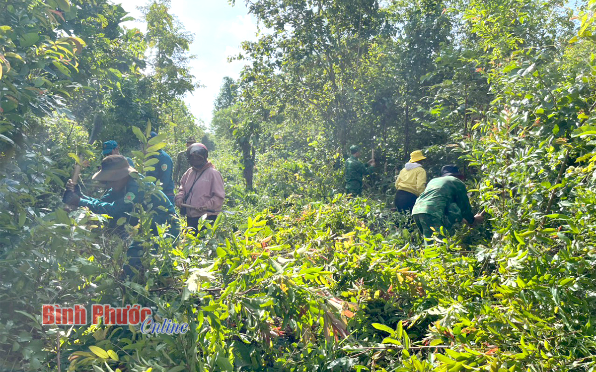 Phụ nữ dân tộc thiểu số ấp 8B, xã Lộc Hòa, huyện Lộc Ninh cùng cán bộ, chiến sĩ Đồn biên phòng cửa khẩu quốc tế Hoa Lư phát quang thông tuyến đường biên giới