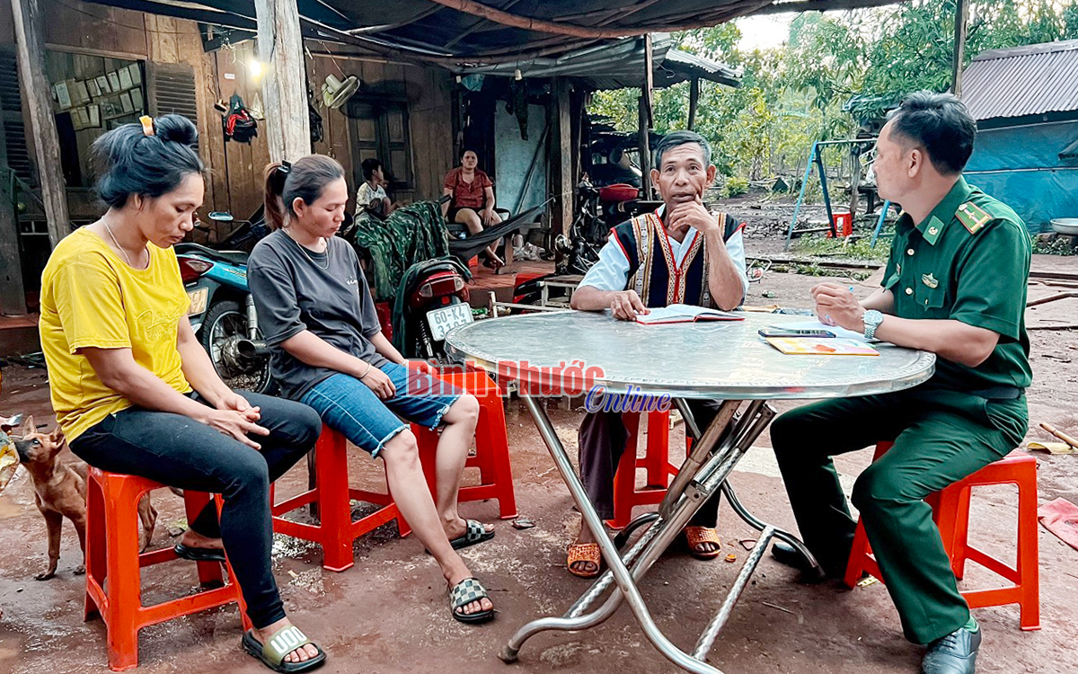 Già làng Điểu Đốc cùng cán bộ Đồn biên phòng Bù Đốp tuyên truyền, vận động người dân trên địa bàn tuân thủ pháp luật, chăm lo làm ăn phát triển kinh tế