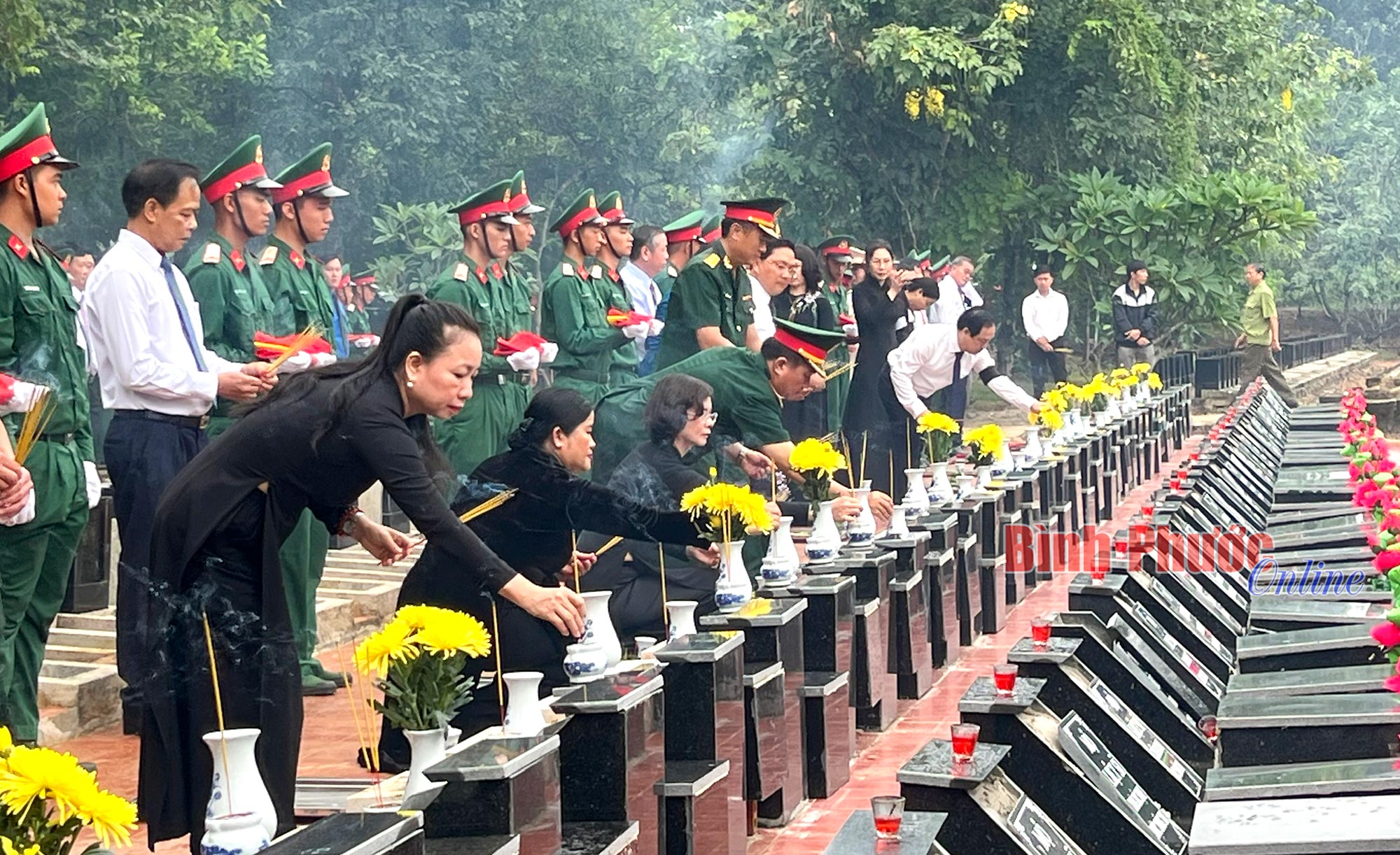 Lãnh đạo tỉnh thắp nén nhang thơm tại lễ an táng hài cốt liệt sĩ quân tình nguyện Việt Nam hy sinh trong các thời kỳ chiến tranh ở nước bạn Campuchia, tại Nghĩa trang liệt sĩ tỉnh Bình Phước, ngày 27-7-2023