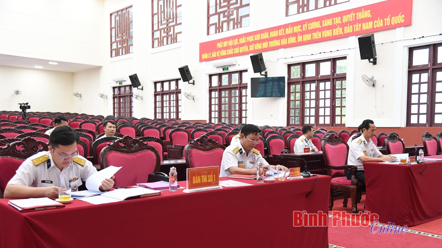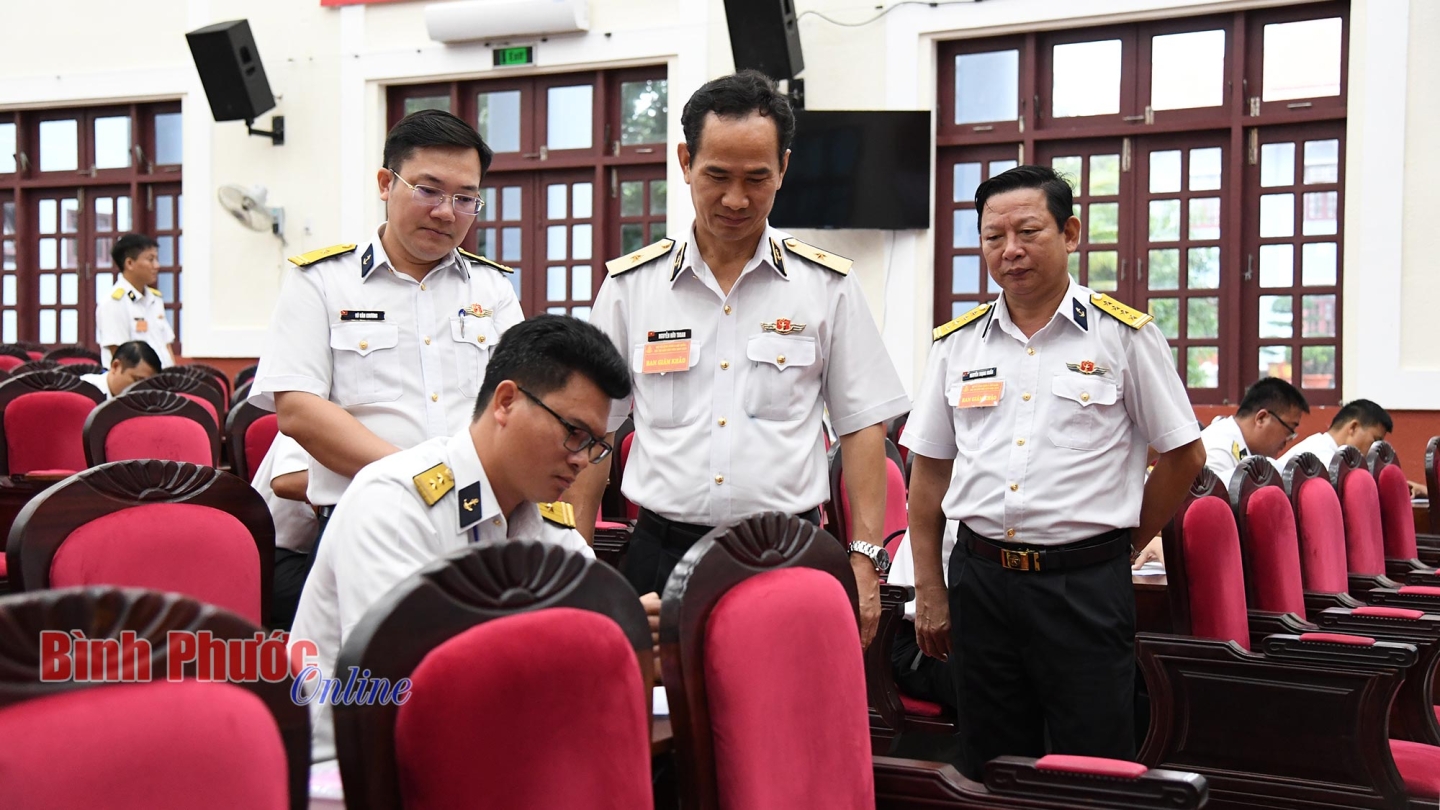 Chuẩn Đô đốc Nguyễn Hữu Thoan kiểm tra thí sinh thực hiện phần thi nhận thức, kỹ năng, nghiệp vụ báo cáo viên