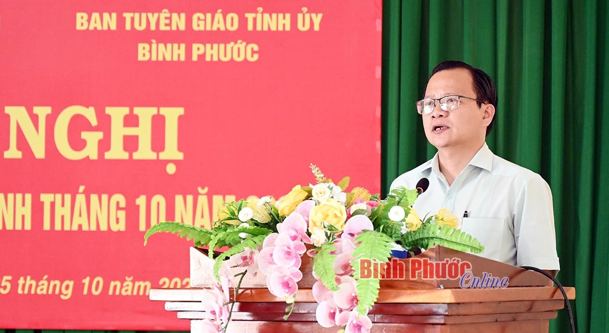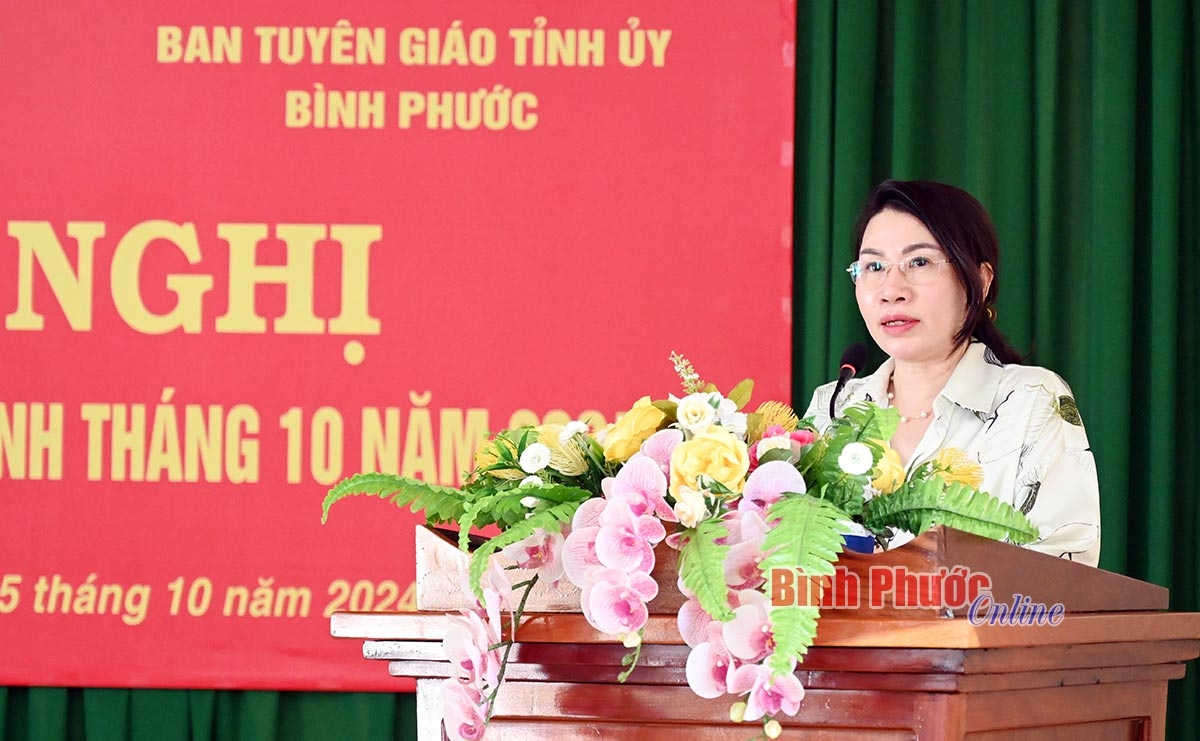 Phó Trưởng ban Thường trực Ban Tuyên giáo Tỉnh ủy Đào Thị Lanh cũng đề nghị tiếp tục tuyên truyền kỷ niệm 55 năm thực hiện Di chúc của Chủ tịch Hồ Chí Minh (1969-2024); tình hình kinh tế - xã hội của tỉnh, trong đó nhấn mạnh 12 nhóm giải pháp trọng tâm, 5 nhiệm vụ quan trọng, cấp thiết được Thủ tướng Chính phủ đưa ra tại hội nghị Chính phủ với các địa phương tháng 9-2024, yêu cầu các bộ, ngành, địa phương tiếp tục thực hiện đồng bộ, quyết liệt nhằm thực hiện thắng lợi toàn diện các mục tiêu, nhiệm vụ của năm 2024.