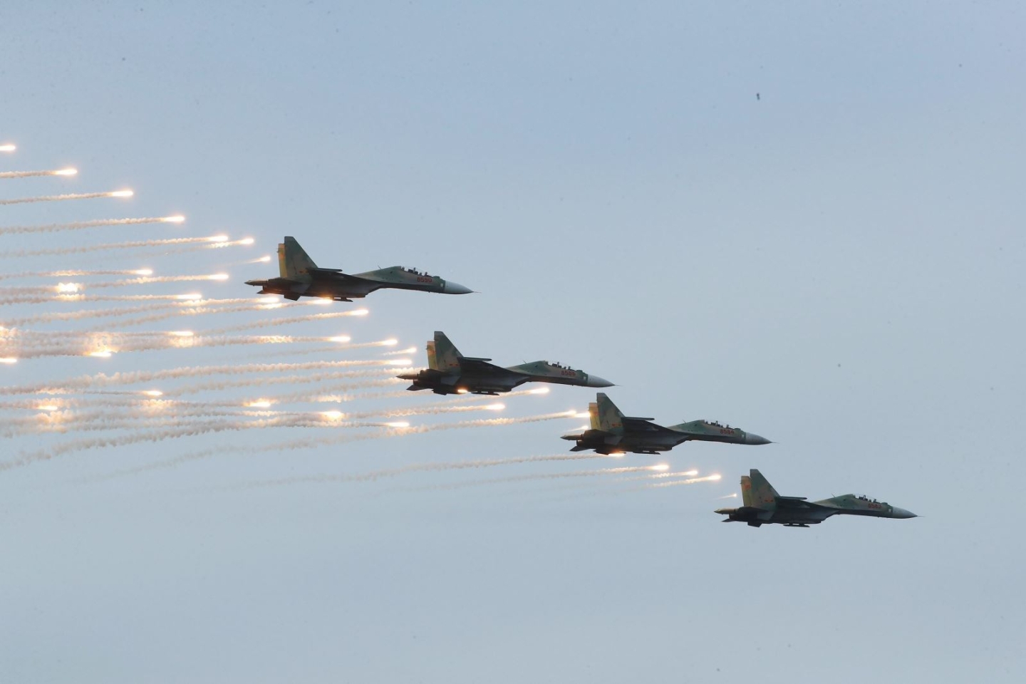 Máy bay Su30-MK2 trình diễn ''Bắn đạn nhiễu bẫy tên lửa'' tại lễ khai mạc Triển lãm Quốc phòng Quốc tế. Ảnh: Trọng Đức/TTXVN