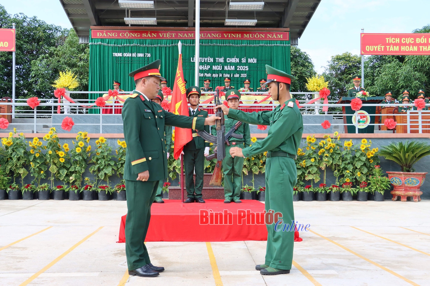 Trung tá Phan Quý Khách, Trung đoàn trưởng Trung đoàn Bộ binh 736 trao vũ khí cho chiến sĩ, đánh dấu bước trưởng thành đầu tiên của các tân binh sau 3 tháng huấn luyện