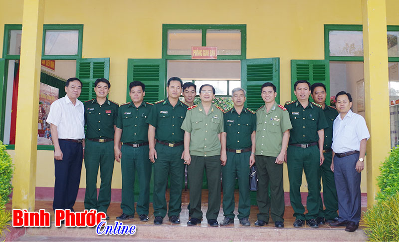 Thiếu tướng Hoàng Văn Huệ và lãnh đạo huyện Bù Đốp chụp hình lưu niệm với lãnh đạo Đồn biên phòng Đắk Quýt