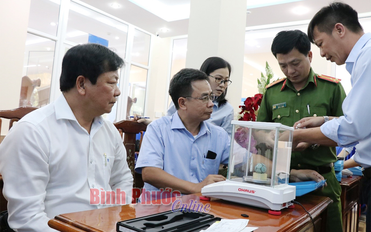 Phó chủ tịch UBND tỉnh Trần Văn Mi cùng đại diện thành viên Hội đồng giám sát kiểm tra kích thước của bóng