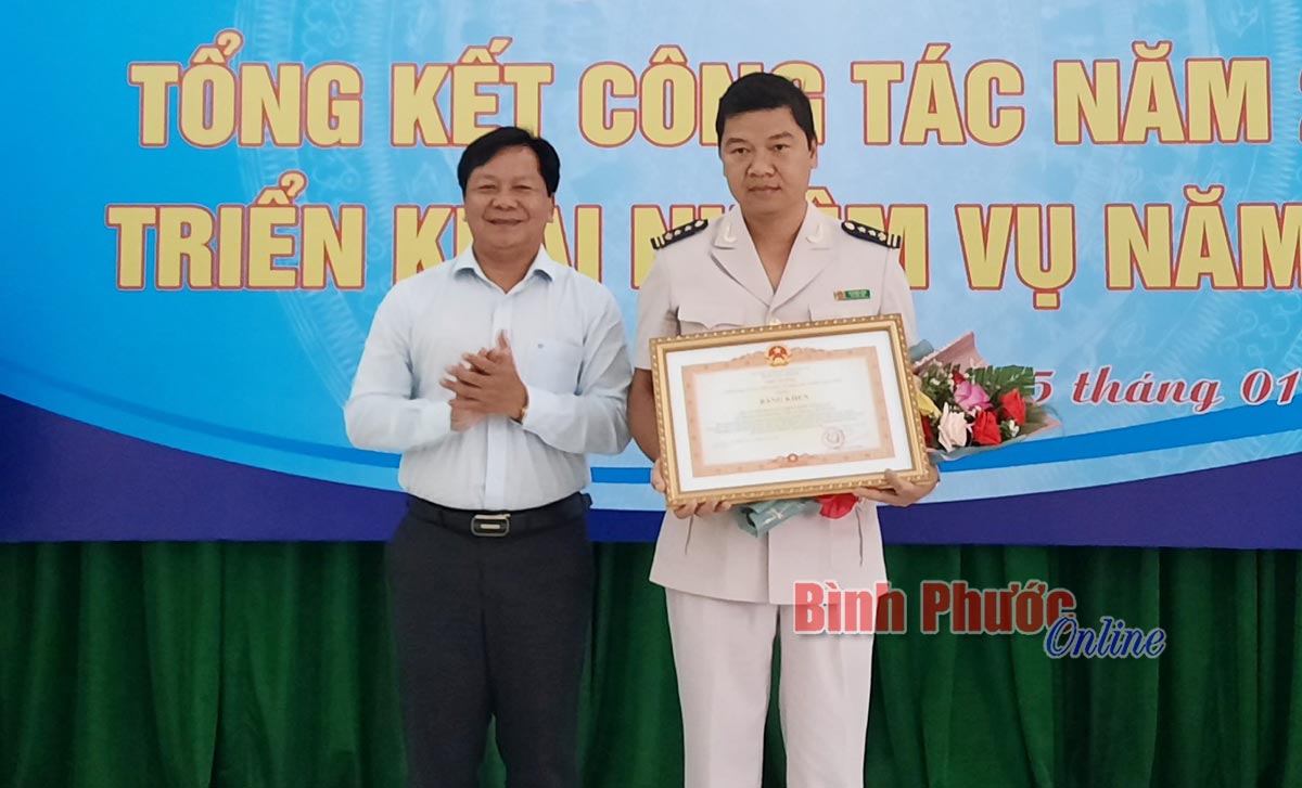 Phó chủ tịch UBND tỉnh Trần Văn Mi trao bằng khen của Thủ tướng Chính phủ cho Chi cục Hải quan Cửa khẩu quốc tế Hoa Lư