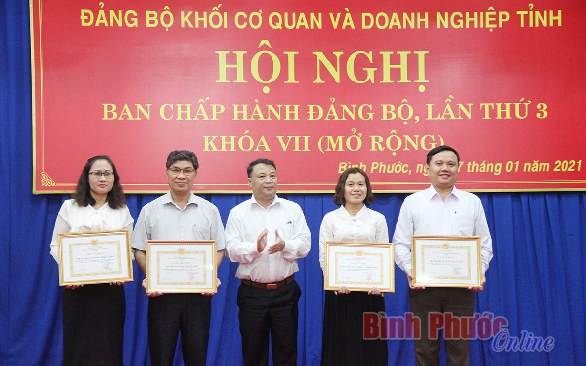 Dịp này, Ban chấp hành Đảng bộ Khối CQ&DN tỉnh đã tặng giấy khen cho các tập thể, cá nhân có thành tích tiêu biểu trong công tác chuẩn bị, tham mưu và phục vụ Đại hội đại biểu Đảng bộ Khối lần thứ VII, nhiệm kỳ 2020-2025 và hoàn thành xuất sắc nhiệm vụ, công tác năm 2020, giai đoạn 2015-2020.