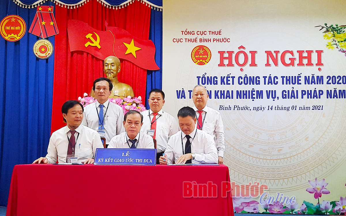 Tại hội nghị, sau khi phát động thi đua, các đơn vị trực thuộc Cục Thuế tỉnh đã cùng nhau ký kết vào bản giao ước thi đua năm 2021.