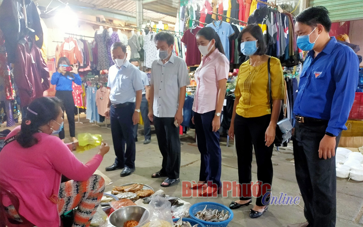 Kiểm tra công tác phun xịt khử khuẩn và vận động tiểu thương chợ Tân Lập thực hiện các biện pháp phòng, chống dịch Covid-19