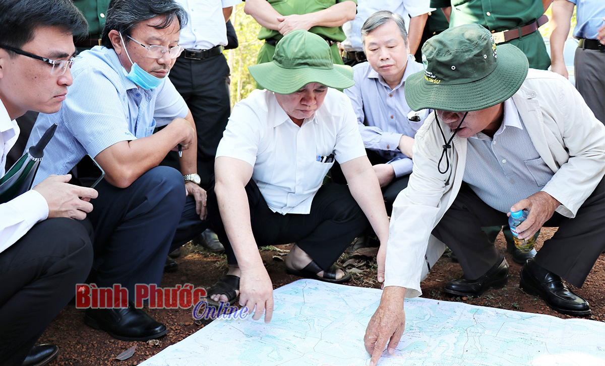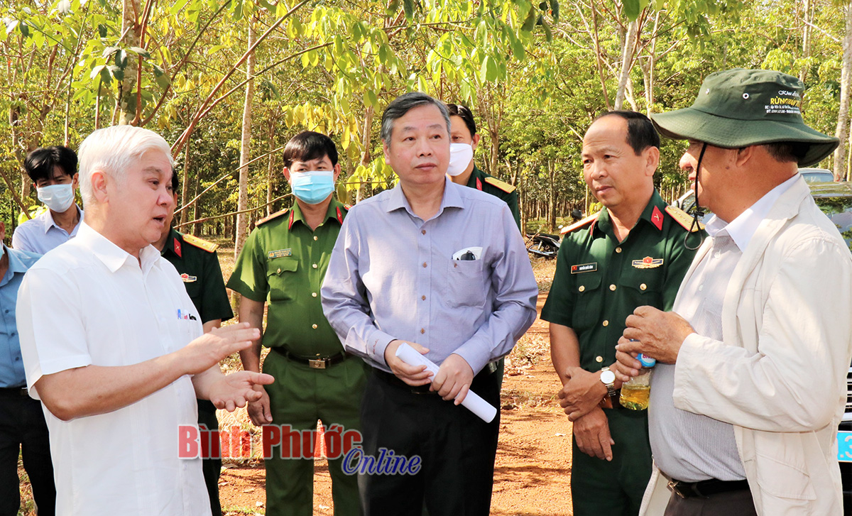 Bí thư Tỉnh ủy Nguyễn Văn Lợi (thứ nhất, từ trái qua) trao đổi với nguyên Bí thư Tỉnh ủy Nguyễn Tấn Hưng tại hiện trường sân bay Técníc Hớn Quản