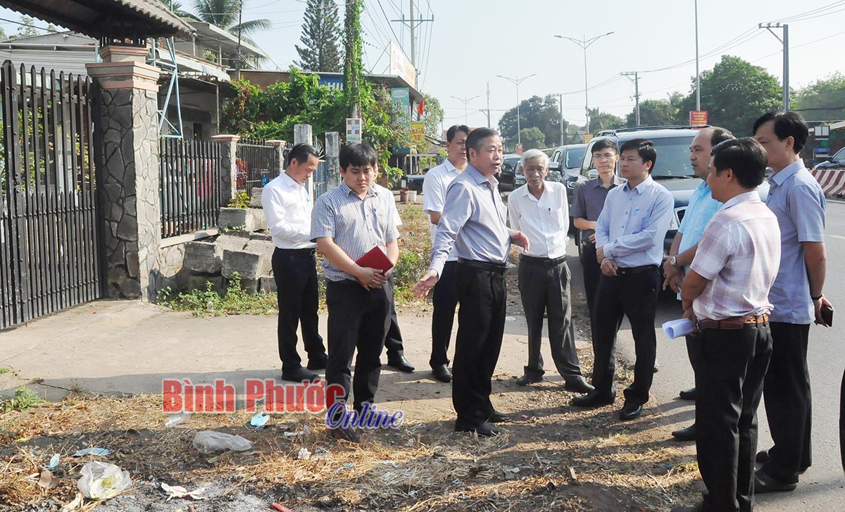 Phó chủ tịch UBND tỉnh Huỳnh Anh Minh và lãnh đạo các đơn vị kiểm tra giải phóng mặt bằng hành lang ĐT.741 đoạn xã Tân Lập, huyện Đồng Phú - khu vực còn 7 hộ dân chưa bàn giao mặt bằng do chưa đồng thuận về mức đền bù