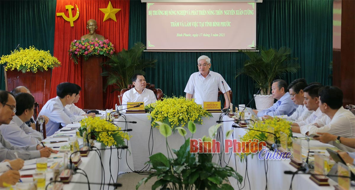 Phát biểu tại buổi làm việc, Bí thư Tỉnh ủy Nguyễn Văn Lợi cho rằng, xác định nông nghiệp là thế mạnh trong cơ cấu kinh tế, tỉnh đã ban hành nhiều nghị quyết thực hiện để nông nghiệp Bình Phước phát triển bền vững. Do đó, những định hướng phát triển, các đề án thực hiện trong thời gian tới của tỉnh rất cần sự quan tâm của bộ về công tác tư vấn, hỗ trợ.