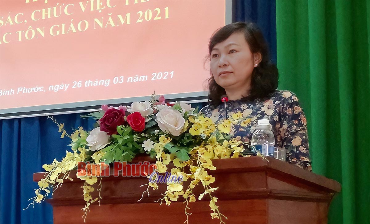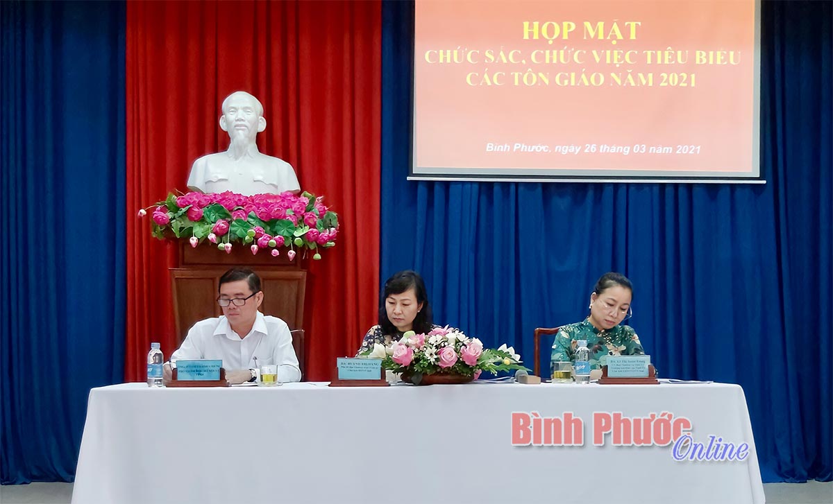Phát biểu tại buổi họp mặt, Phó bí thư thường trực Tỉnh ủy, Chủ tịch HĐND tỉnh Huỳnh Thị Hằng nhấn mạnh: Những năm qua, các vị chức sắc, lãnh đạo các tổ chức tôn giáo và đồng bào theo tôn giáo đã có những đóng góp to lớn vào thành tựu chung của tỉnh. Với giáo lý nhân văn, bác ái của mình, các tôn giáo ở tỉnh đã cụ thể hóa thành những hành động thiết thực, cứu người, giúp đời, chung tay xây dựng Bình Phước giàu đẹp.