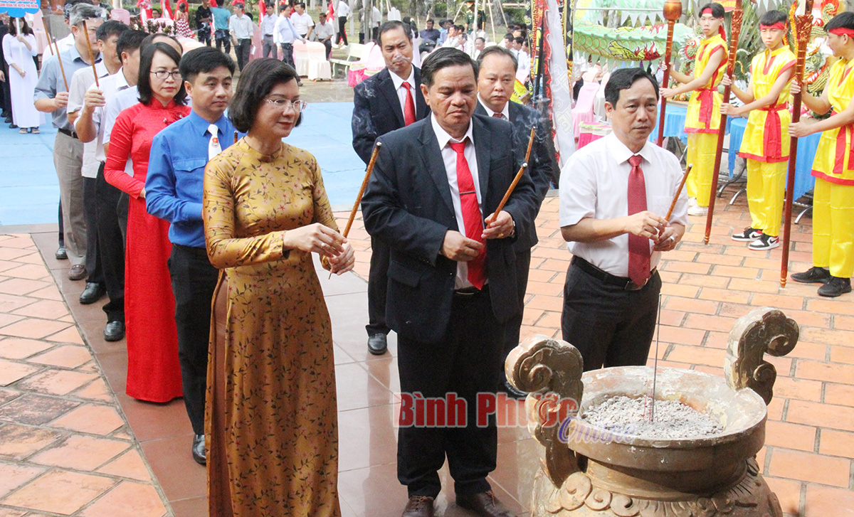 Phó chủ tịch HĐND tỉnh Lê Hoàng Lâm và Phó chủ tịch UBND tỉnh Trần Tuyết Minh dâng hương lên bàn thờ các Vua Hùng tại Đền thờ Vua Hùng, xã Phú Riềng, huyện Phú Riềng