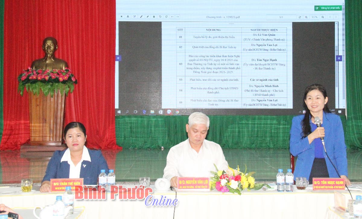 Báo cáo tại buổi làm việc, Ủy viên dự khuyết Trung ương Đảng, Ủy viên Ban Thường vụ Tỉnh ủy, Bí thư Thành ủy Đồng Xoài Tôn Ngọc Hạnh cho biết, thực hiện Nghị quyết số 03-NQ/TU, Thành ủy Đồng Xoài đã tổ chức hội nghị quán triệt trong toàn thể cán bộ chủ chốt cấp ủy, chính quyền các cấp trên địa bàn thành phố. Đồng thời, cụ thể hóa bằng các chương trình, kế hoạch cụ thể.
