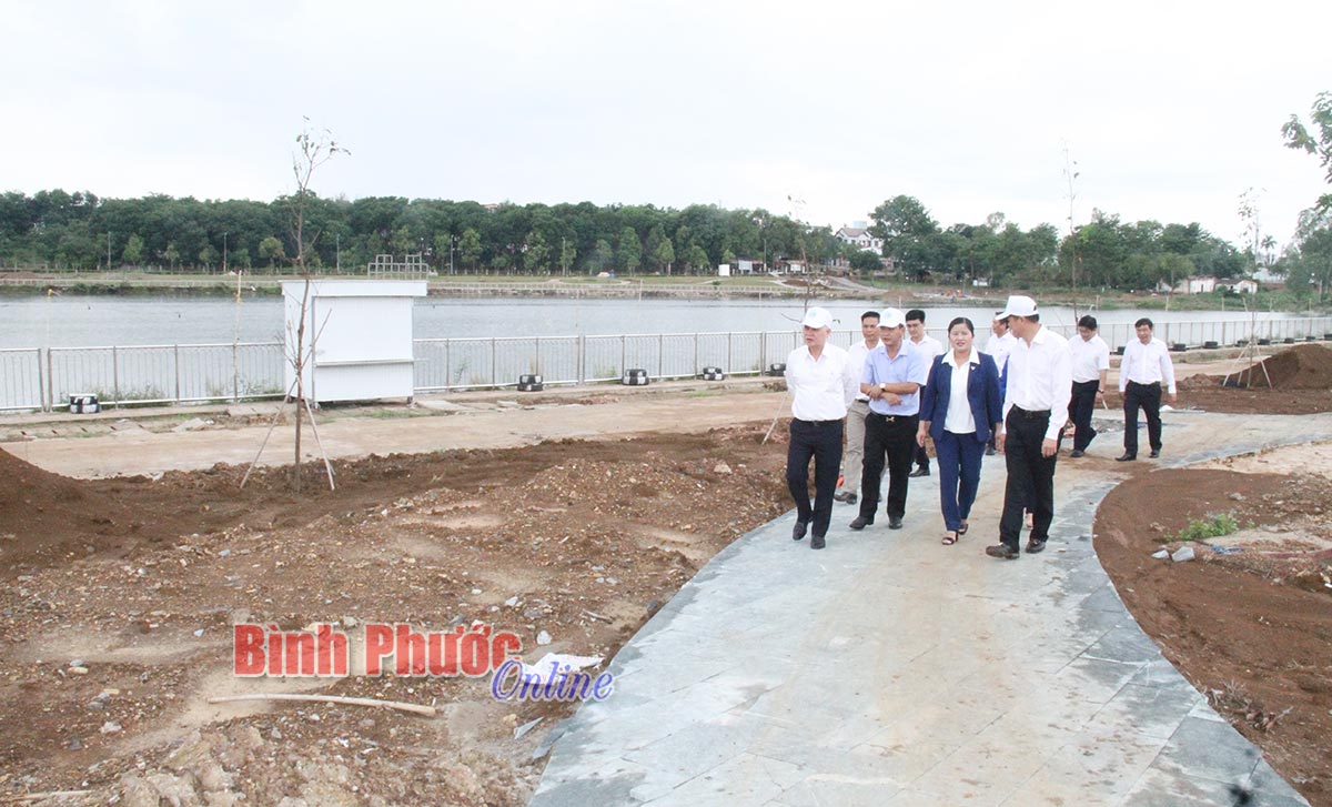Bí thư Tỉnh ủy Nguyễn Văn Lợi và Chủ tịch UBND tỉnh Trần Tuệ Hiền cùng đoàn công tác của tỉnh đi kiểm tra tiến độ xây dựng công viên hồ suối Cam