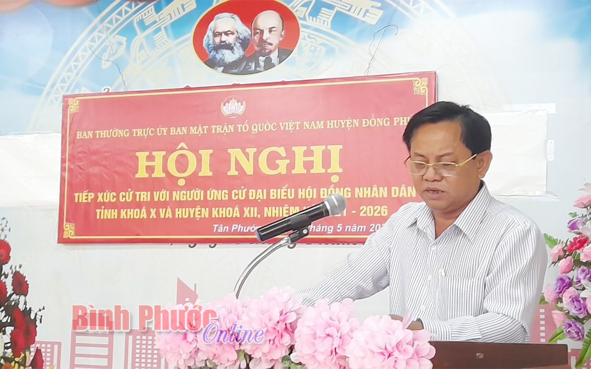 Bí thư Huyện ủy, Chủ tịch HĐND huyện Đồng Phú Trần Văn Vinh, người ứng cử đại biểu HĐND tỉnh khóa X trình bày chương trình hành động