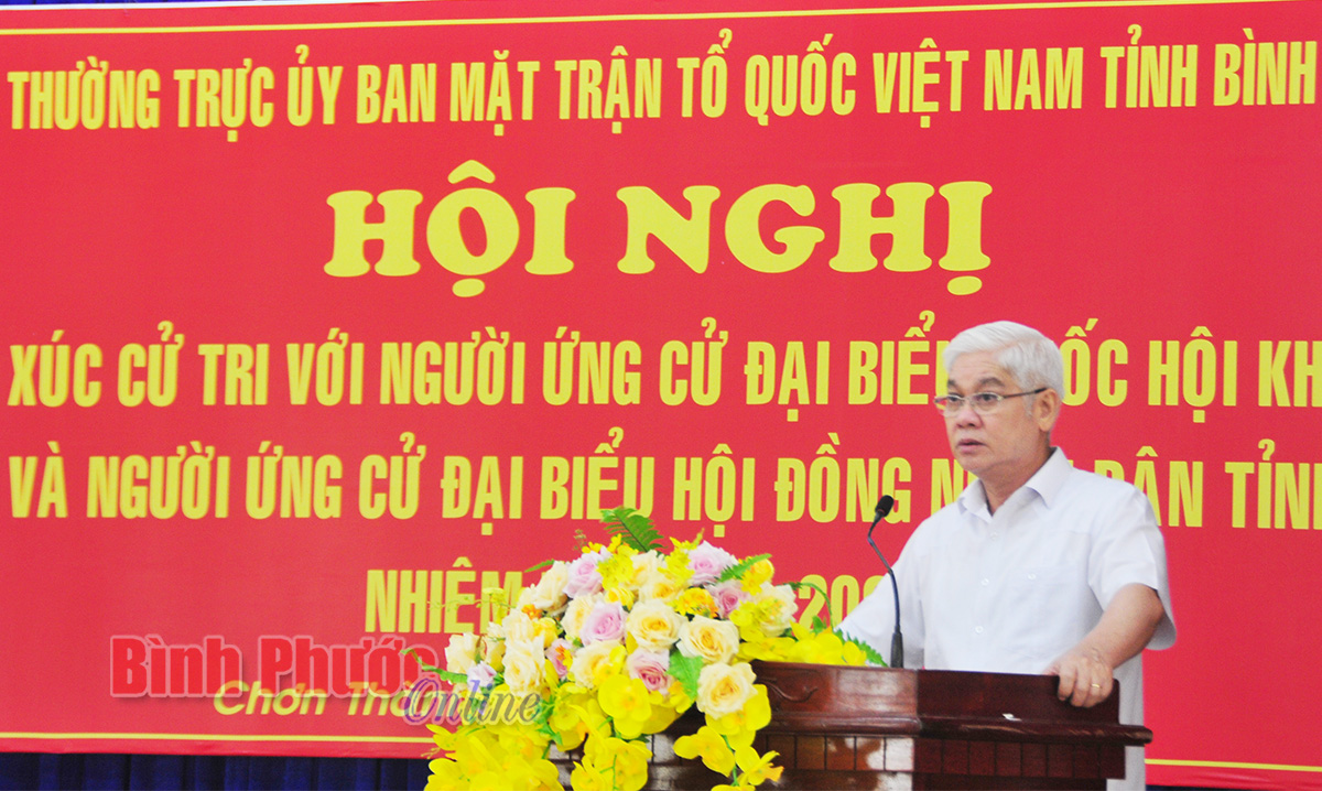 Ủy viên Trung ương Đảng, Bí thư Tỉnh ủy Nguyễn Văn Lợi, người ứng cử đại biểu Quốc hội khóa XV trình bày chương trình hành động của mình trước cử tri Chơn Thành