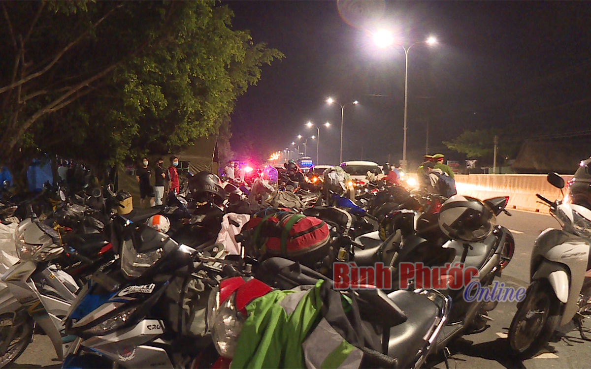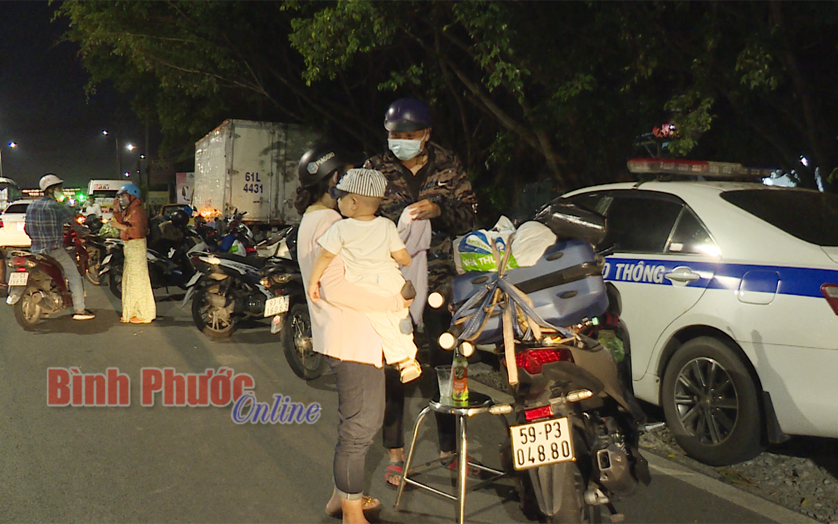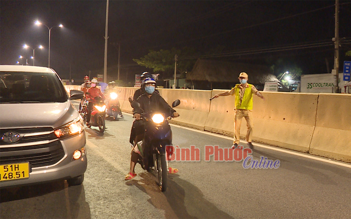 Do TP. Hồ Chí Minh quyết định giãn cách xã hội từ 0 giờ ngày 31-5, nên rất đông người dân trở về tỉnh Bình Phước. Mặc dù đã hơn 23 giờ, nhưng từng đoàn xe vẫn xếp hàng tại khu vực chốt kiểm soát. An ninh trật tự trong khu vực được đảm bảo