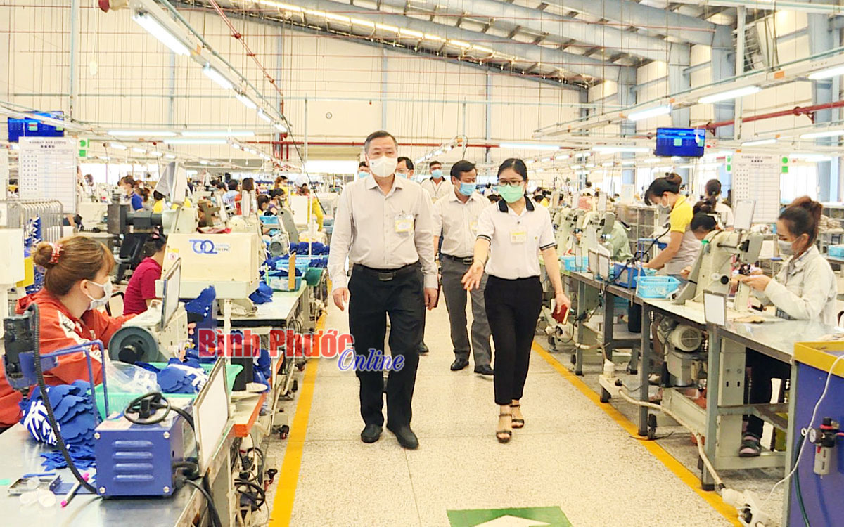 Phó chủ tịch UBND tỉnh Huỳnh Anh Minh kiểm tra thực tế công tác phòng, chống dịch tại khu vực phân xưởng Công ty TNHH Shyang Ying. Ảnh: Như Nam