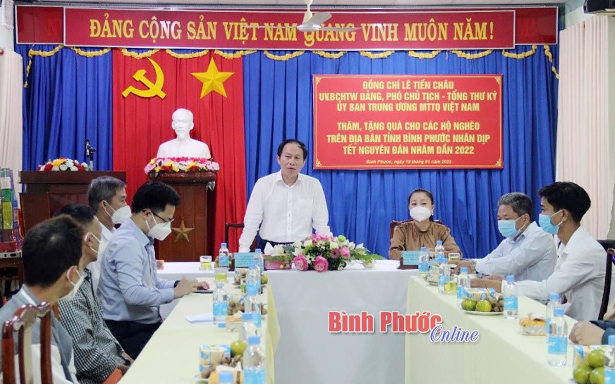 Ông Lê Tiến Châu, Trưởng đoàn công tác đánh giá cao hoạt động của hệ thống MTTQ các cấp trong tỉnh, đồng thời đề nghị các đơn vị tiếp tục nỗ lực, sáng tạo chăm lo đời sống người dân. Hệ thống MTTQ các cấp tỉnh Bình Phước cần nỗ lực hơn nữa trong công tác giám sát, phản biện xã hội; mặt trận phải tham gia vào trong các dự án phát triển kinh tế - xã hội; xây dựng đội ngũ làm công tác mặt trận đảm bảo nhiệm vụ theo từng vị trí việc làm… MTTQ phải là trung tâm tập hợp đại đoàn kết toàn dân tộc.