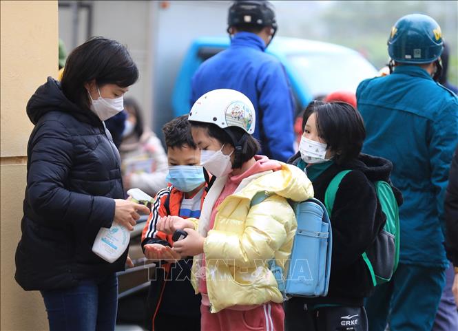 Đo thân nhiệt cho học sinh Trường THCS Nguyễn Du, thành phố Thái Nguyên trước khi vào lớp. Ảnh minh họa: Hoàng Nguyên/TTXVN