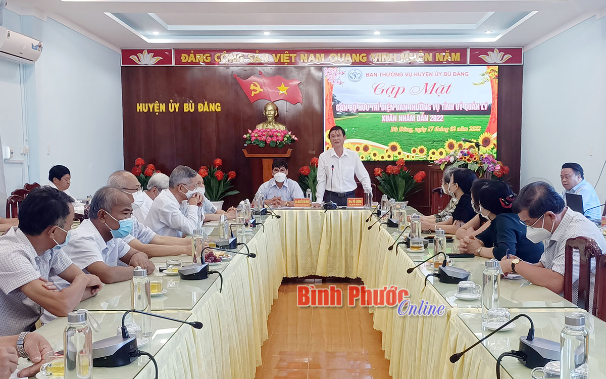 Bí thư Huyện ủy Bù Đăng Vũ Lương đã trân trọng cám ơn những đóng góp quý báu cũng như tình cảm của các đồng chí nguyên là lãnh đạo thuộc diện Ban Thường vụ Tỉnh ủy quản lý cho tỉnh và huyện Bù Đăng thời gian qua. Đồng thời mong muốn tiếp tục nhận được sự quan tâm đóng góp và đồng hành với huyện để xây dựng Bù Đăng ngày càng phát triển.