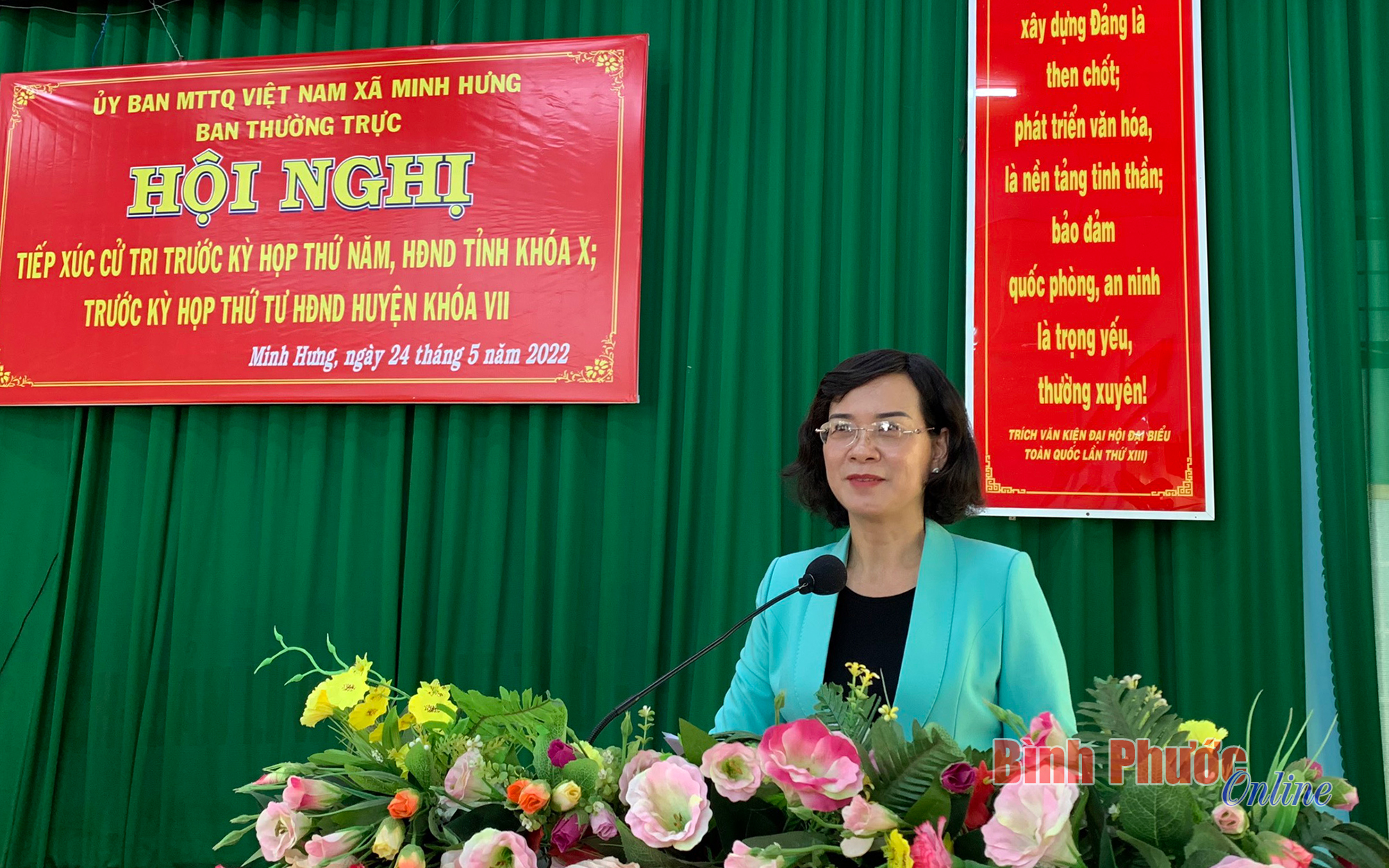 100% ý kiến, kiến nghị của cử tri đã được đại diện các sở, ban, ngành của tỉnh, UBND huyện Bù Đăng và xã Minh Hưng giải trình đầy đủ, thỏa đáng. Dịp này, Ủy viên Ban Thường vụ Tỉnh ủy, Phó chủ tịch UBND tỉnh Trần Tuyết Minh đã thông tin đến cử tri về tình hình phát triển kinh tế - xã hội và lĩnh vực an sinh xã hội của tỉnh trong những tháng đầu năm 2022.