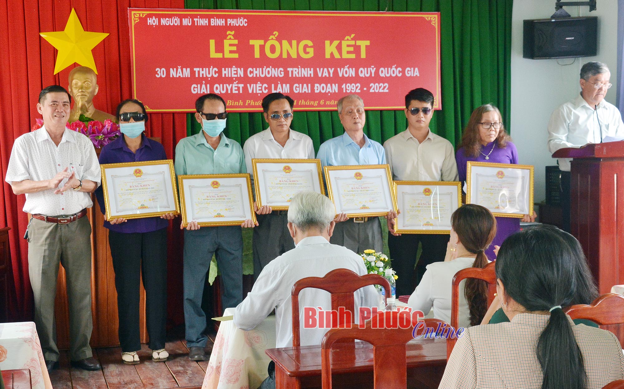 Dịp này, Hội Người mù tỉnh Bình Phước đã được tặng bằng khen của Thủ tướng Chính phủ vì đã có thành tích trong công tác chăm lo, giúp đỡ hội viên có hoàn cảnh khó khăn, giúp nhau làm kinh tế giỏi giai đoạn 2016-2020. UBND tỉnh tặng bằng khen cho 6 tập thể, 13 cá nhân có thành tích tiêu biểu, xuất sắc trong thực hiện Chương trình vay vốn Quỹ quốc gia giải quyết việc làm.