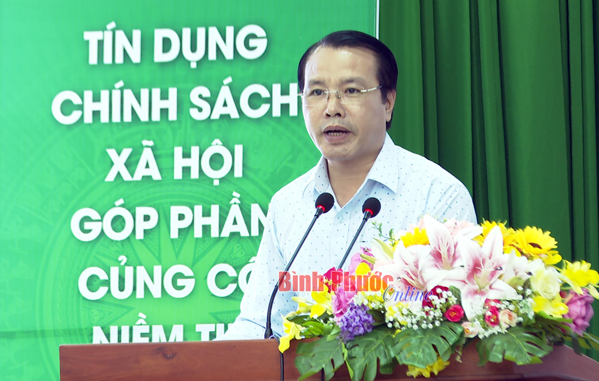 Phó chủ tịch UBND thành phố Đồng Xoài, Trưởng ban đại diện Hội đồng quản trị Ngân hàng CSXH thành phố Ngô Hồng Khang phát biểu tại hội nghị