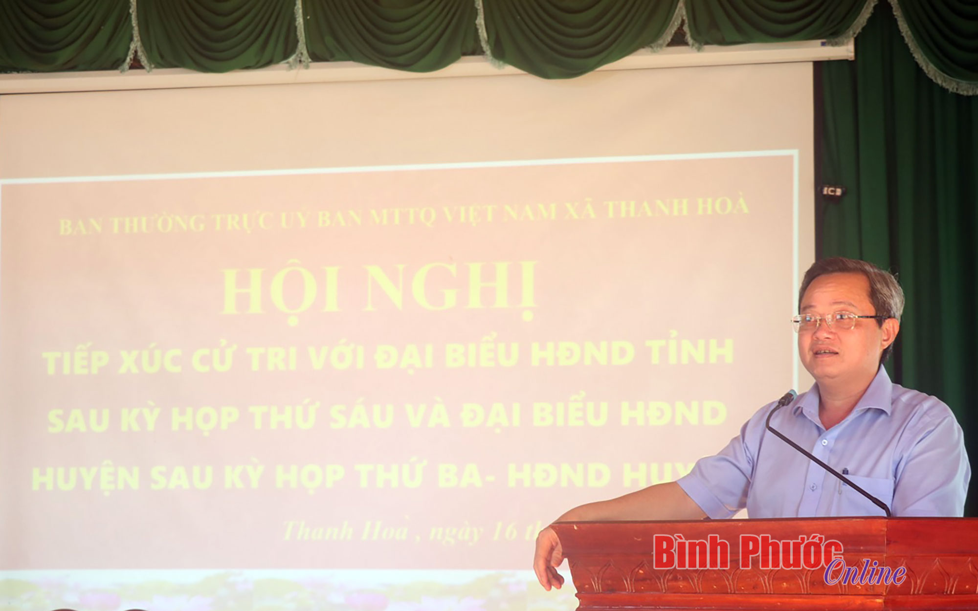 Ủy viên Ban Thường vụ, Trưởng ban Nội chính Tỉnh ủy Nguyễn Minh Hợi thông báo kết quả kỳ họp thứ 6, HĐND tỉnh khóa X, nhiệm kỳ 2021-2026 tại buổi tiếp xúc với cử tri xã Thanh Hòa, huyện Bù Đốp