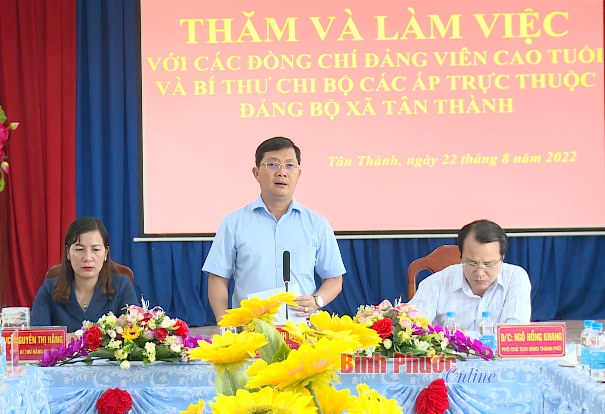 Tại buổi gặp, Ủy viên Ban Thường vụ Tỉnh ủy, Bí thư Thành ủy Đồng Xoài Hà Anh Dũng đã thông tin đến bí thư chi bộ khu dân cư và các đảng viên cao tuổi Đảng thuộc Đảng bộ xã Tân Thành về các chủ trương, định hướng lớn trong phát triển kinh tế - xã hội thành phố. Cụ thể như: Định hướng về phát triển hệ thống hạ tầng, công tác quy hoạch đô thị, quy hoạch đất đai, kế hoạch triển khai các Nghị quyết về phát triển đô thị thành phố Đồng Xoài giai đoạn 2021-2025, định hướng đến 2030. Mục tiêu đến năm 2025, thành phố Đồng Xoài đạt tiêu chí đô thị loại II, hoàn thành xây dựng chính quyền điện tử, từng bước chuyển dần sang chính quyền số.