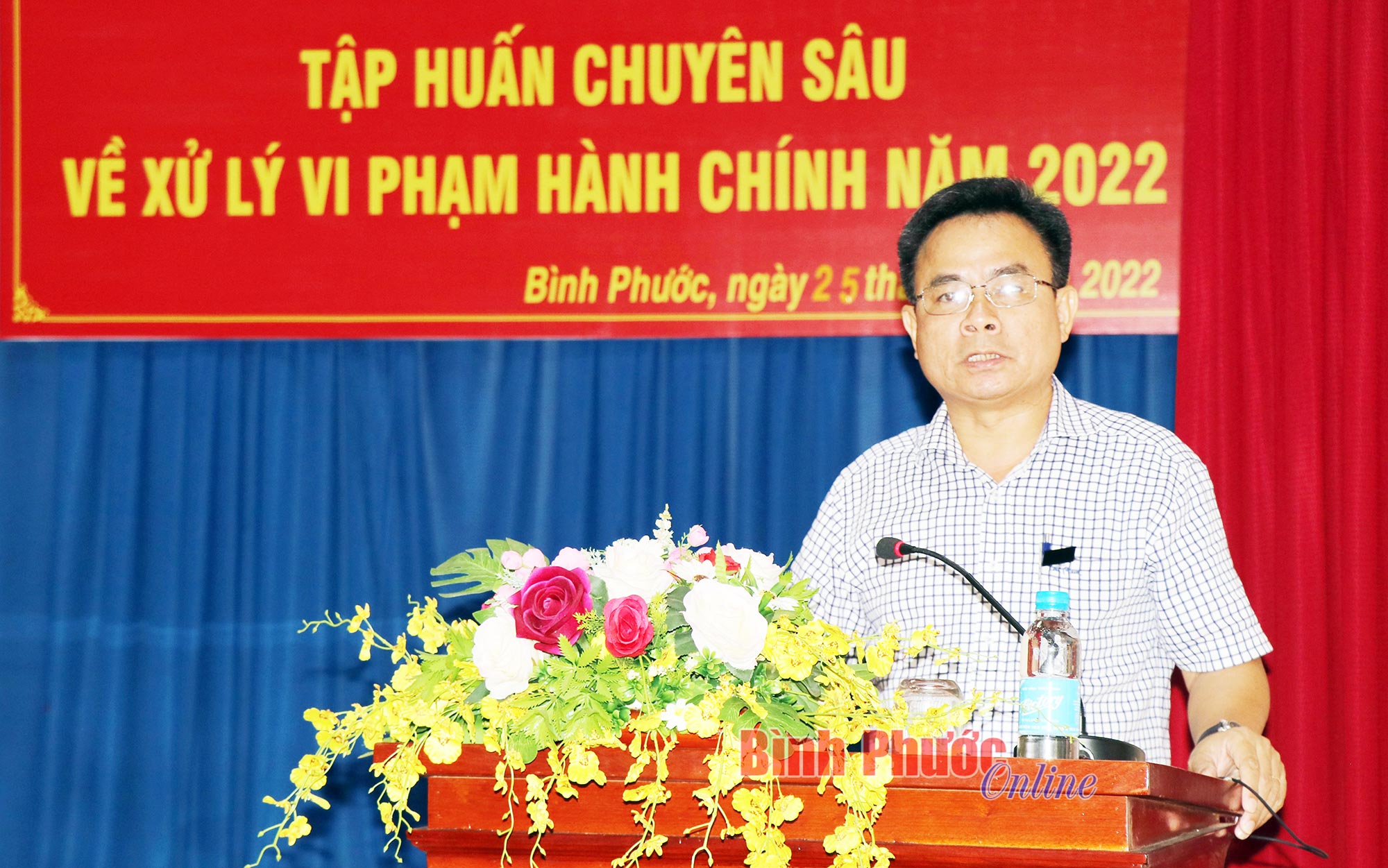 Giám đốc Sở Tư pháp tỉnh Bình Phước Lê Tiến Hiếu phát biểu khai mạc hội nghị tập huấn chuyên sâu về xử lý vi phạm hành chính năm 2022