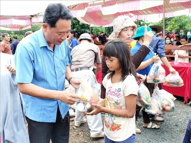 Trưởng Ban Dân tộc tỉnh Bình Phước Lý Trọng Nhân tặng quà cho người nghèo xã Đắk Ơ, huyện biên giới Bù Gia Mập. Ảnh: TTXVN