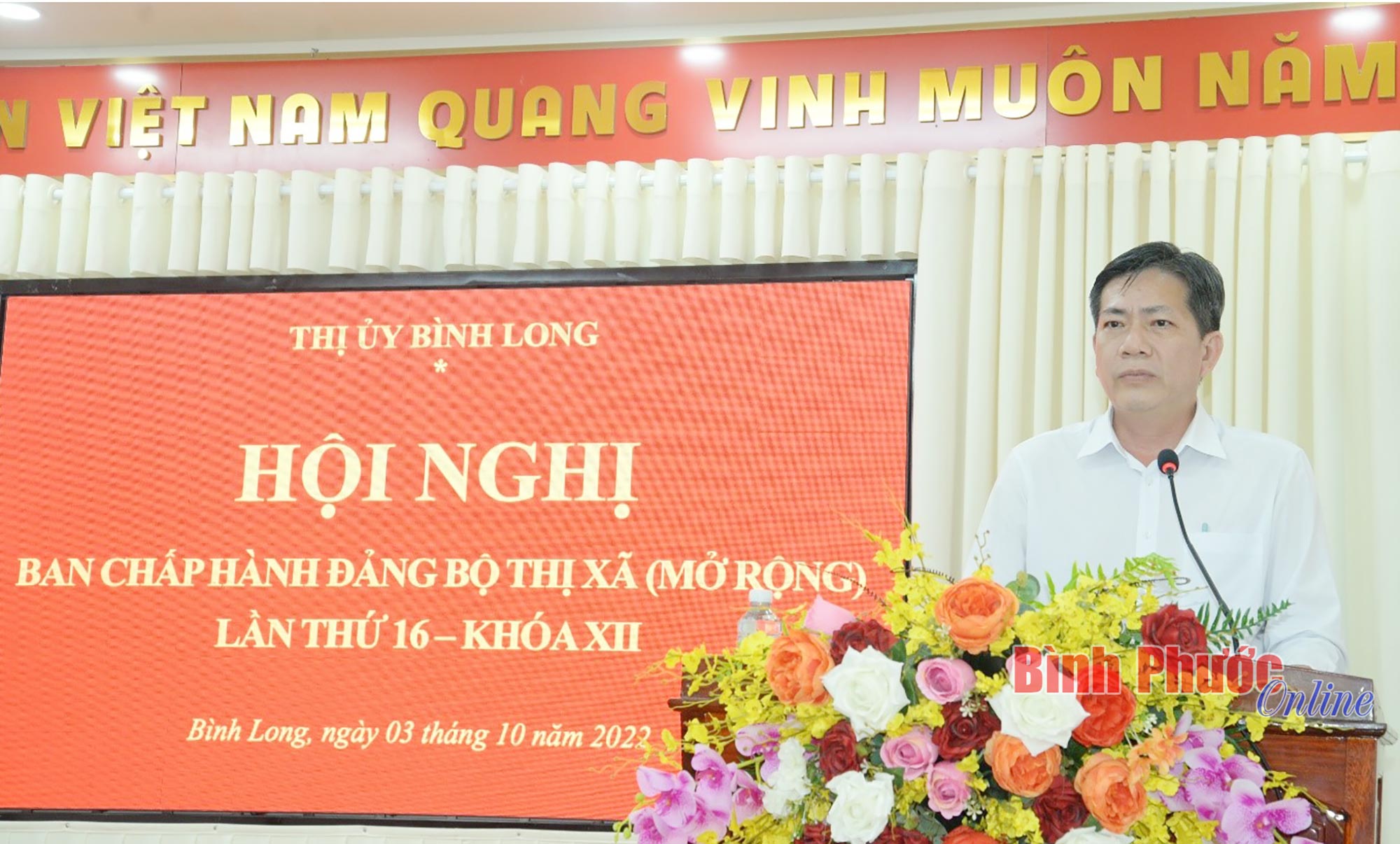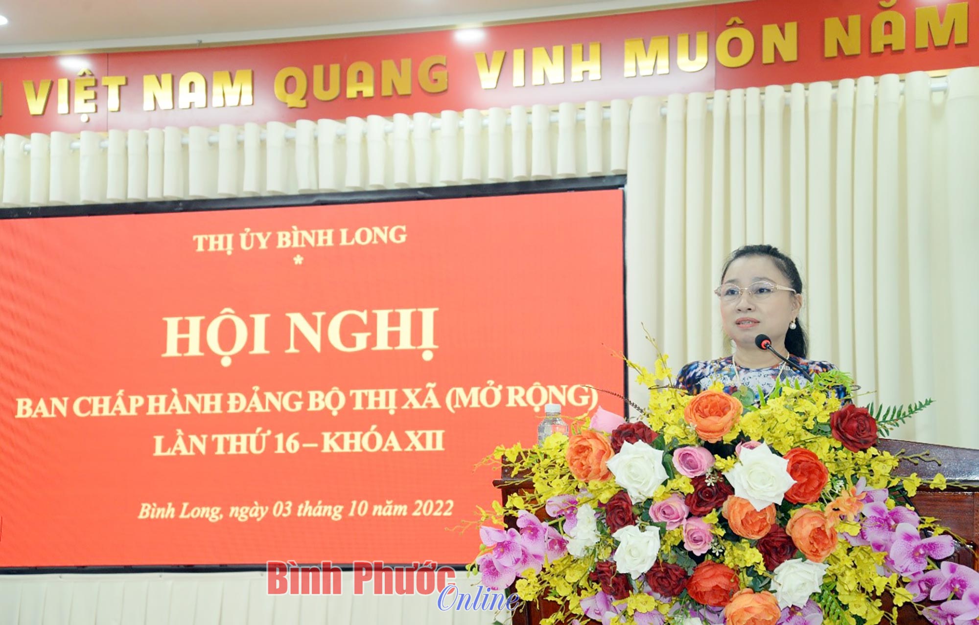 Phát biểu tại hội nghị, Ủy viên Ban Thường vụ, Trưởng ban Dân vận Tỉnh ủy, Chủ tịch Ủy ban MTTQ Việt Nam tỉnh Lê Thị Xuân Trang đề nghị, thời gian tới Ban Chấp hành Đảng bộ thị xã Bình Long cần tăng cường công tác lãnh đạo, chỉ đạo các ngành đề ra giải pháp tháo gõ những khó khăn vướng mắc trong việc thực hiện các nhiệm vụ kinh tế - chính trị của địa phương, đặc biệt là trong công tác giải ngân vốn đầu tư công. Phải đầu tư có trọng tâm, trọng điểm tránh dàn trải, chọn những dự án làm thay đổi mạnh mẽ bộ mặt đô thị thị xã.