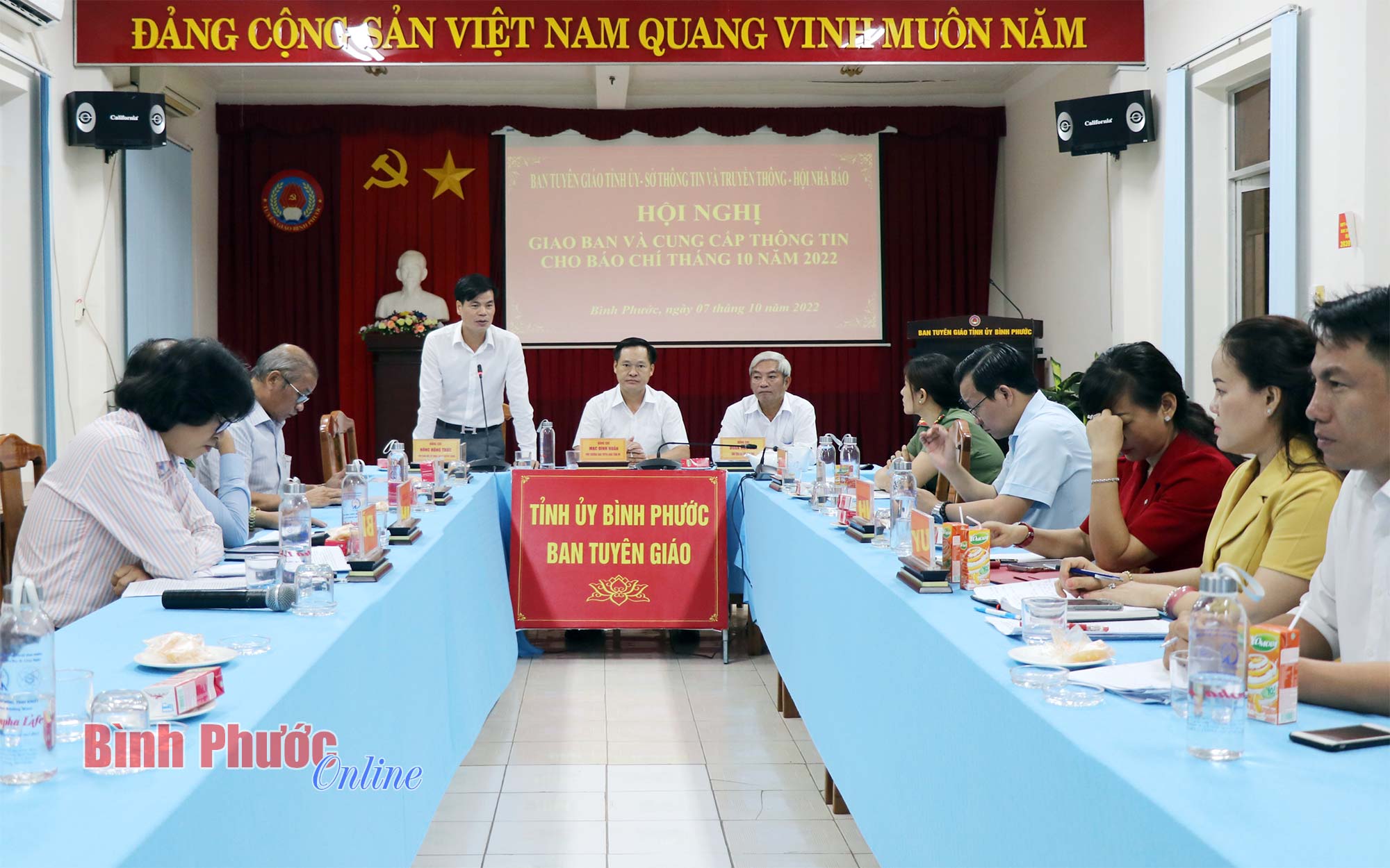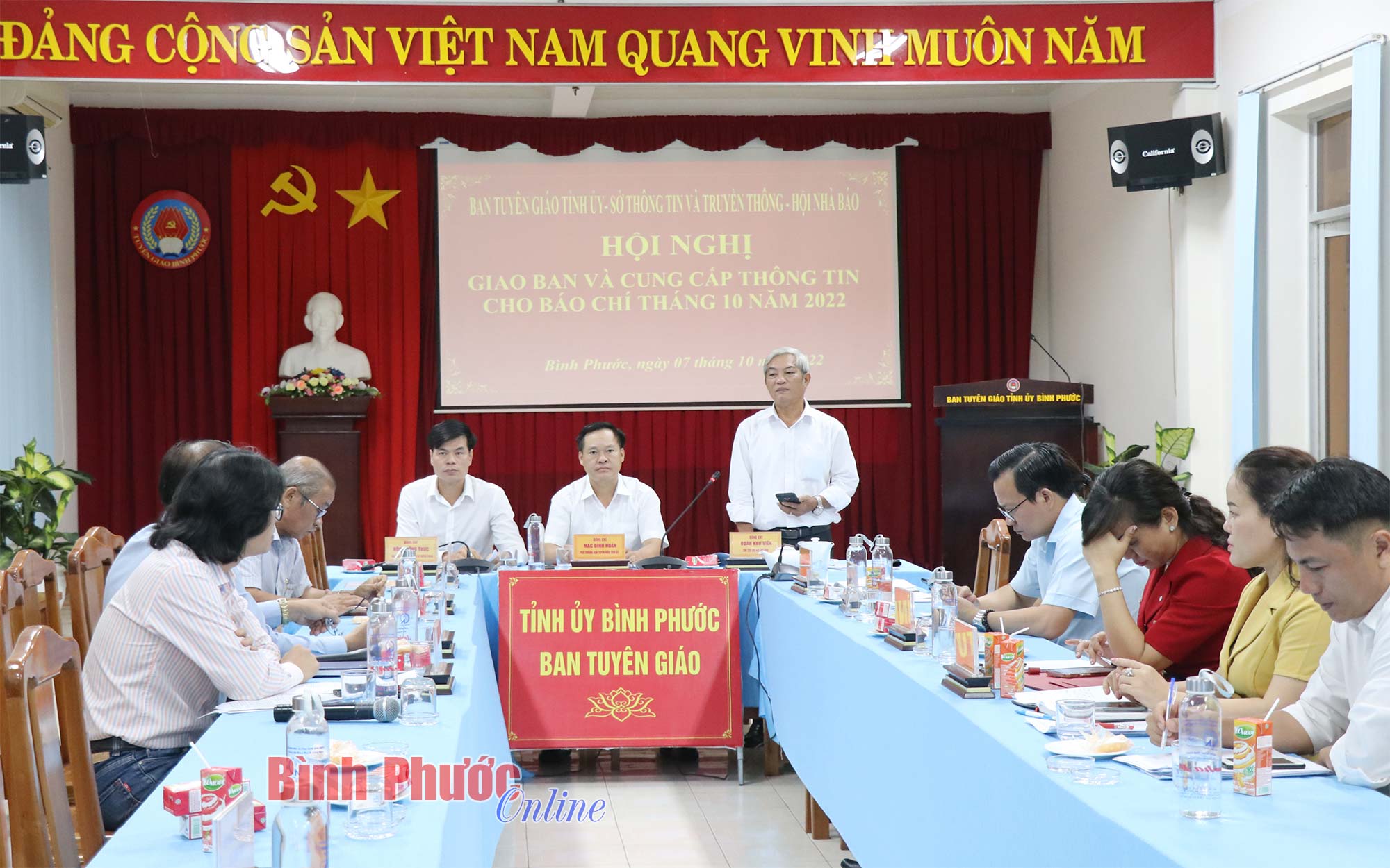 Định hướng tuyên truyền trong tháng 10, Phó trưởng Ban Tuyên giáo Tỉnh ủy Mạc Đình Huấn đề nghị các cơ quan thông tấn, báo chí tập trung: Thông tin, tuyên truyền kết quả Hội nghị lần thứ 6 Ban Chấp hành Trung ương Đảng khóa XIII, kỳ họp thứ 4 Quốc hội khóa XV. Tiếp tục chú trọng tuyên truyền những cách làm hay, hiệu quả của các địa phương, đơn vị trong triển khai, thực hiện Chương trình hành động số 17-CTr/TU ngày 30-9-2021 của Ban Chấp hành Đảng bộ tỉnh thực hiện Nghị quyết Đại hội đại biểu toàn quốc lần thứ XIII của Đảng và Nghị quyết Đại hội đại biểu Đảng bộ tỉnh Bình Phước lần thứ XI, nhiệm kỳ 2020 - 2025.