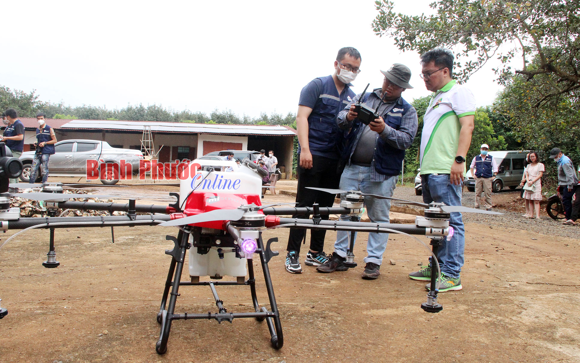 Anh Đặng Dương Minh Hoàng (bìa phải) sử dụng máy bay không người lái phun thuốc cho vườn cây, giúp nâng cao năng suất lao động, tiết kiệm thời gian, chi phí - Ảnh: Ngân Hà