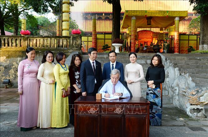 Tổng Thư ký LHQ António Guterres thăm và viết lưu bút tại Hoàng thành Thăng Long. Ảnh: Minh Đức/TTXVN