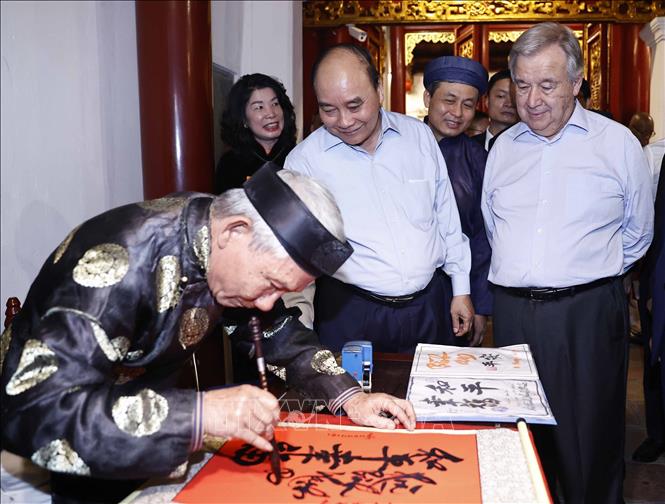Chủ tịch nước Nguyễn Xuân Phúc và Tổng Thư ký LHQ António Guterres xem nhà thư pháp viết chữ tại đền Ngọc Sơn. Ảnh: Thống Nhất/TTXVN