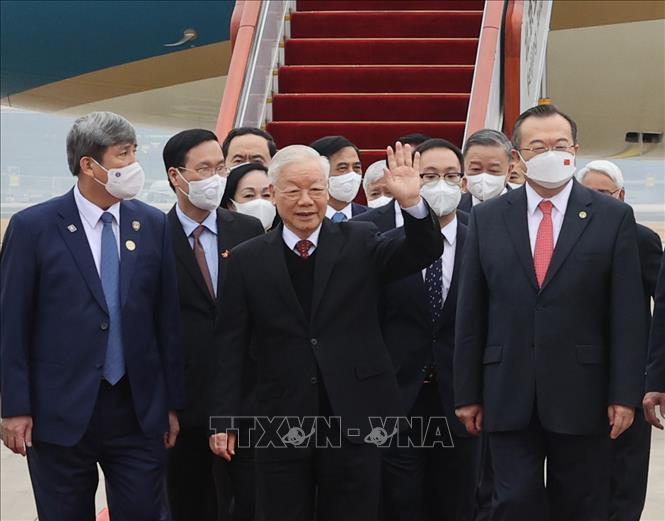 Tổng Bí thư Nguyễn Phú Trọng vẫy chào đại biểu Trung Quốc và cán bộ Đại sứ quán Việt Nam ra đón tại Sân bay Quốc tế Bắc Kinh. Ảnh: Trí Dũng/TTXVN